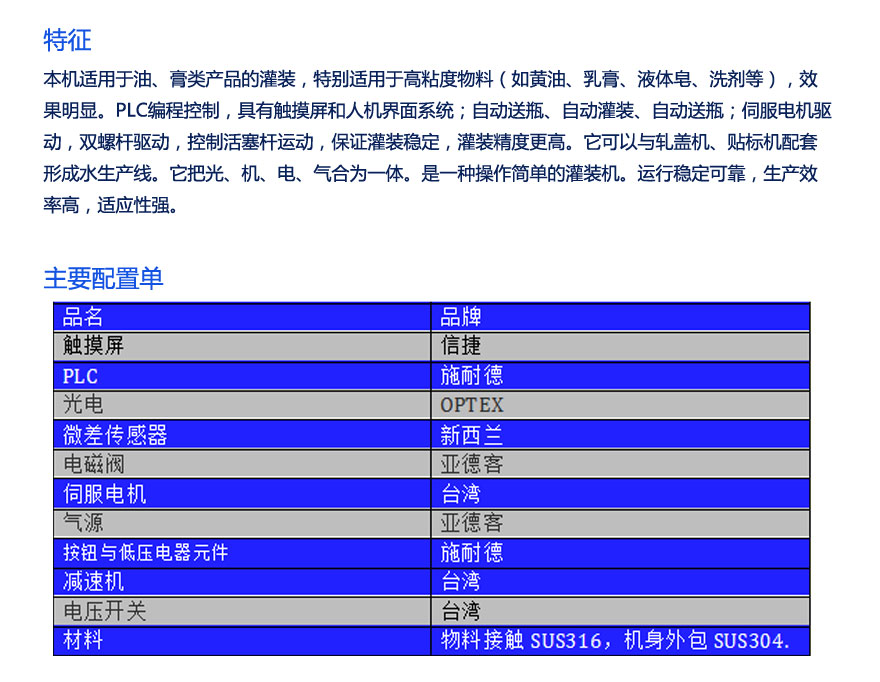 本機適用于水和奶油制品的灌裝,特別是對高粘度物料(如濃辣椒蛋黃醬果醬罐瓶食品花生醬番茄醬膏油等)效果明顯。 PLC編程控制,具有觸摸屏和人機界面系統(tǒng);自動上瓶、自動灌裝、自動出瓶;伺服電機驅動,雙螺桿驅動,控制活塞桿運動,保證灌裝穩(wěn)定性,灌裝精度更高??膳c旋蓋機、貼標機配套組成流水生產(chǎn)線。它集光、機、電、氣于一體。是一種易于操作的灌裝機。具有運行穩(wěn)定可靠、生產(chǎn)效率高、適應性強等特點。本機適用于液體和膏狀產(chǎn)品的灌裝,尤其適用于高粘度物料,效果明顯。