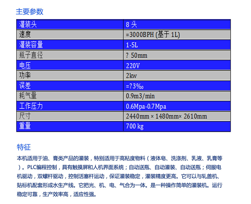 該自動食用油灌裝機(jī)采用伺服滾珠絲杠系統(tǒng)驅(qū)動活塞缸。廣泛應(yīng)用于食品、化工、醫(yī)藥、化妝品、農(nóng)化等行業(yè),適用于灌裝液體,尤其適用于高粘度物料和泡沫液體,如:油、醬油、番茄醬、糖漿、洗滌劑、蜂蜜、洗發(fā)水、乳液、潤滑油, ETC。該機(jī)采用PLC控制,根據(jù)灌裝瓶、固定出料口,其余操作均在觸摸屏上完成。除了具有普通自動伺服活塞灌裝機(jī)的優(yōu)點(diǎn)外,還拓寬了灌裝物料的范圍。如填充物含有顆粒、長條狀的固體成分,也可以進(jìn)行非常有效的填充。
